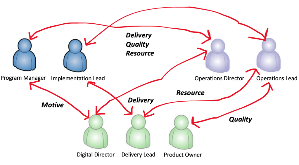In addition, there is likely to be conflict between the Product Owner and the Operations Lead, around the quality of the product. A lot of projects seem to have Product Owners sitting on the digital side. Conflict may be alleviated by ensuring they are sitting on the operational side, properly representing ‘the business’.