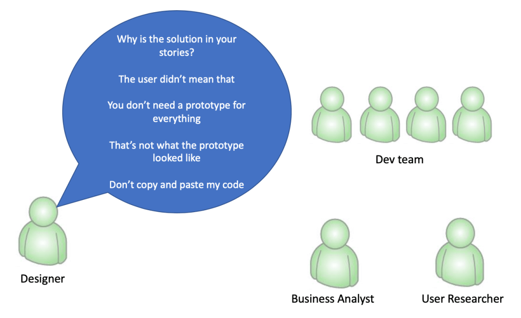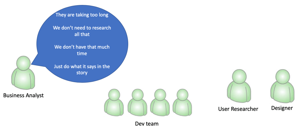 A lot of good work goes into a user story. If it is to be fit for purpose, it should address a user need. in order for it to do this, it must go through research and design iterations, which could take time. Unfortunately, we don’t have time, so we get into conflict. The BA tells the Designer that prototypes are taking too long, or the Researcher that user research is taking too long, is too detailed or out of scope. The design team is constantly reminded about the time pressure that the project faces and a blame culture emerges.