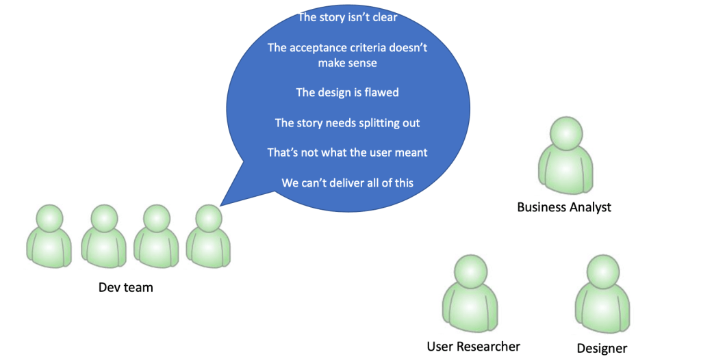 They tell the Business Analyst that the user story isn’t clear, the acceptance criteria doesn’t make sense, or the story needs splitting. They tell the designers that the design is flawed, and the solution is not fit for purpose. The User Researchers are told that ‘the user didn’t mean that’. Inevitably, the Delivery Manager is informed that they can’t deliver everything that has landed on their plate. Who can blame them?